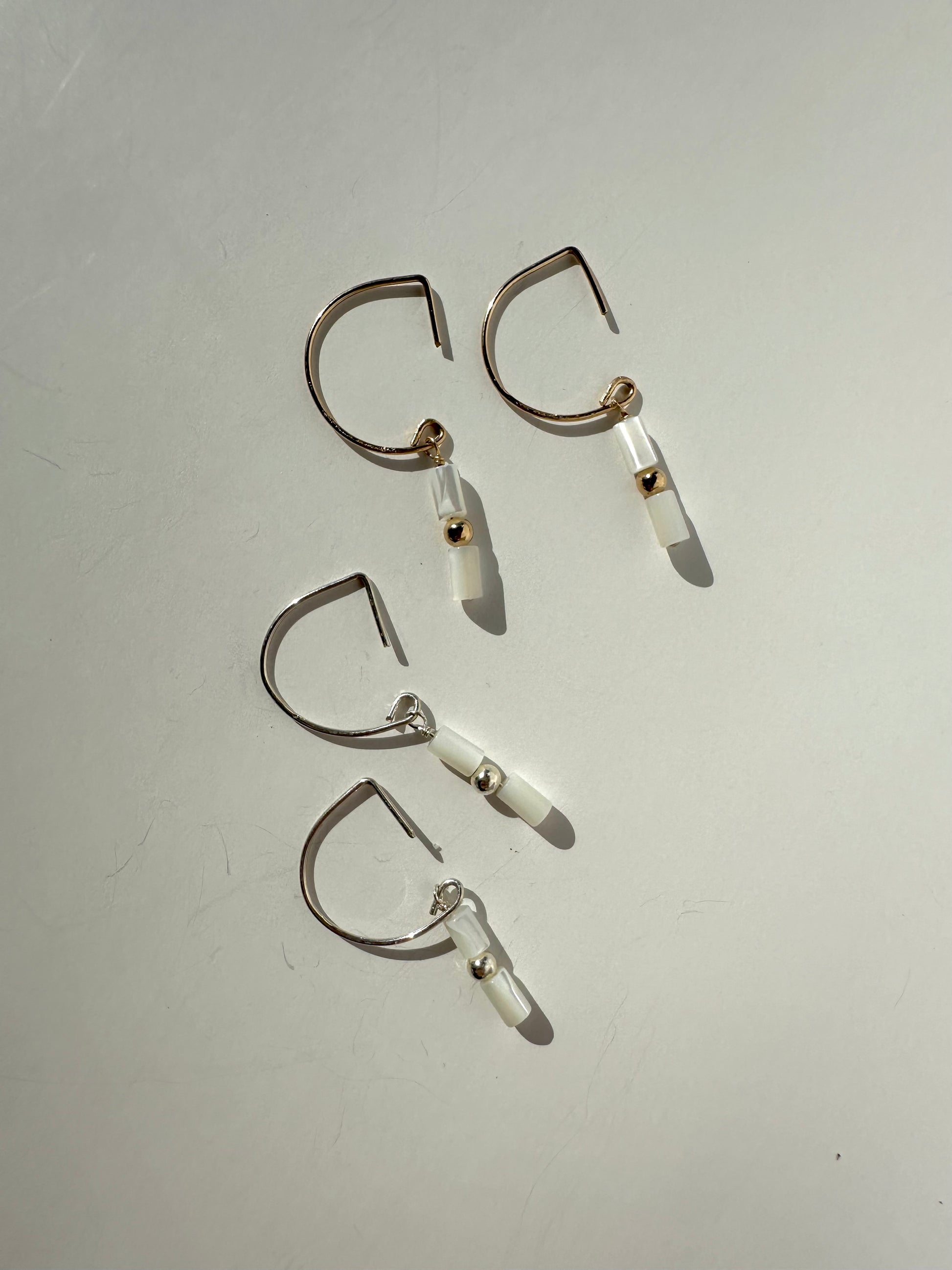 Sleek and luminous, these modern hoops feature a polished drop of mother of pearl accented with a 14k golf filled or sterling silver bead. Lightweight and effortlessly elegant, they add a fresh glow to any look.