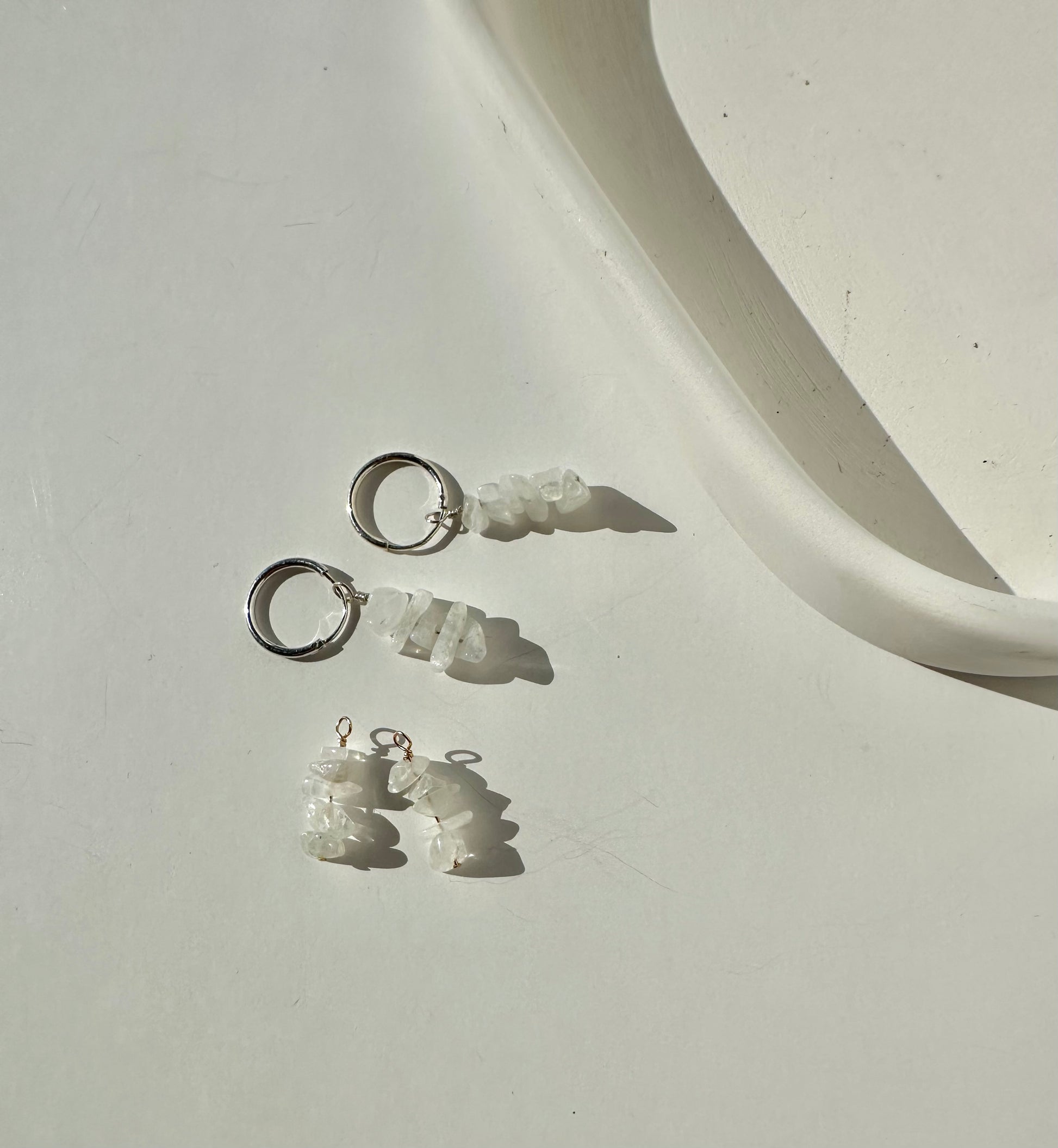 Delicate yet striking, these moonstone charm earrings feature natural chip stones that shimmer with a beautiful glow. Each charm dances lightly from its setting, catching hints of soft blue and pearly light with every movement.