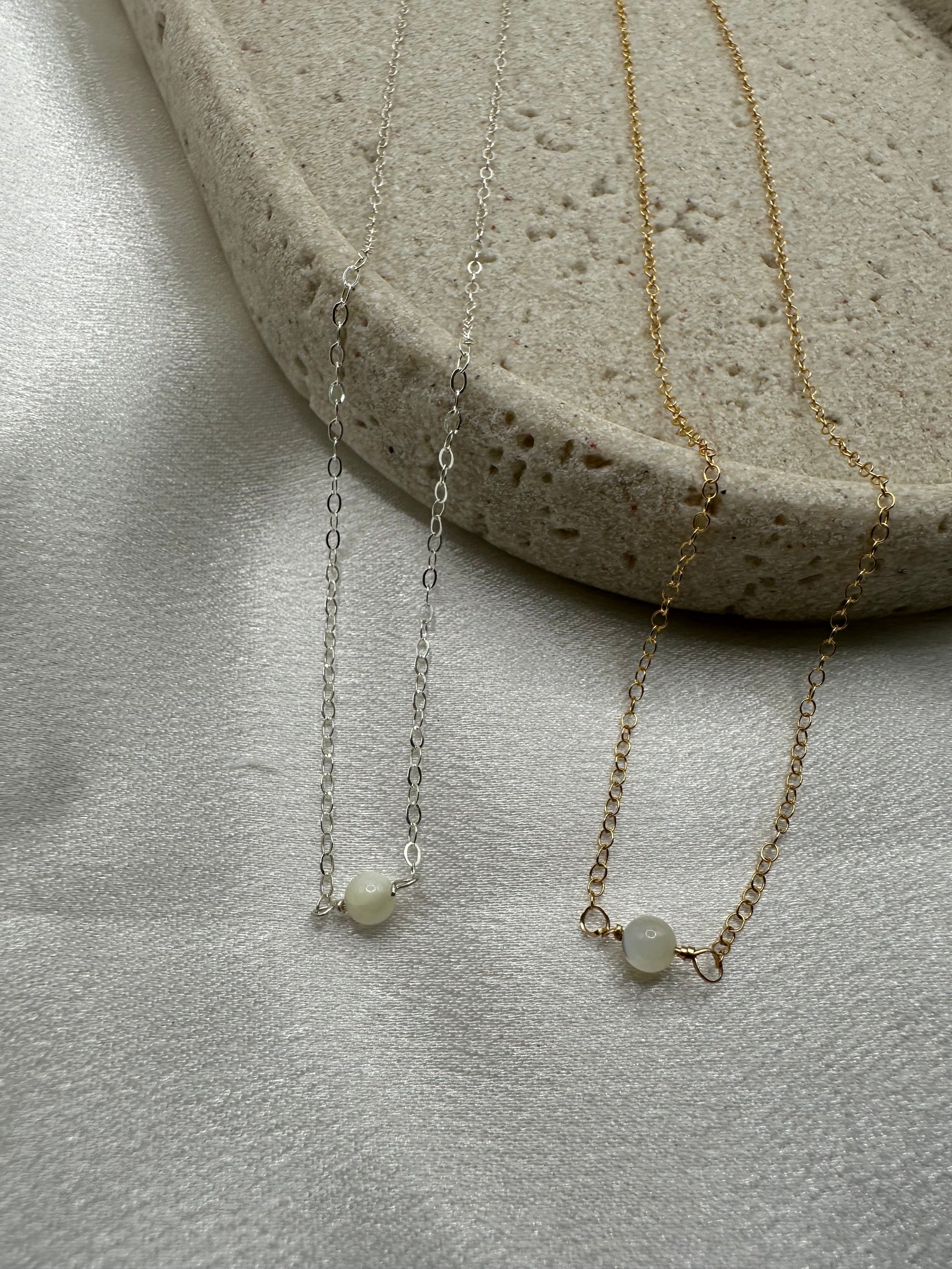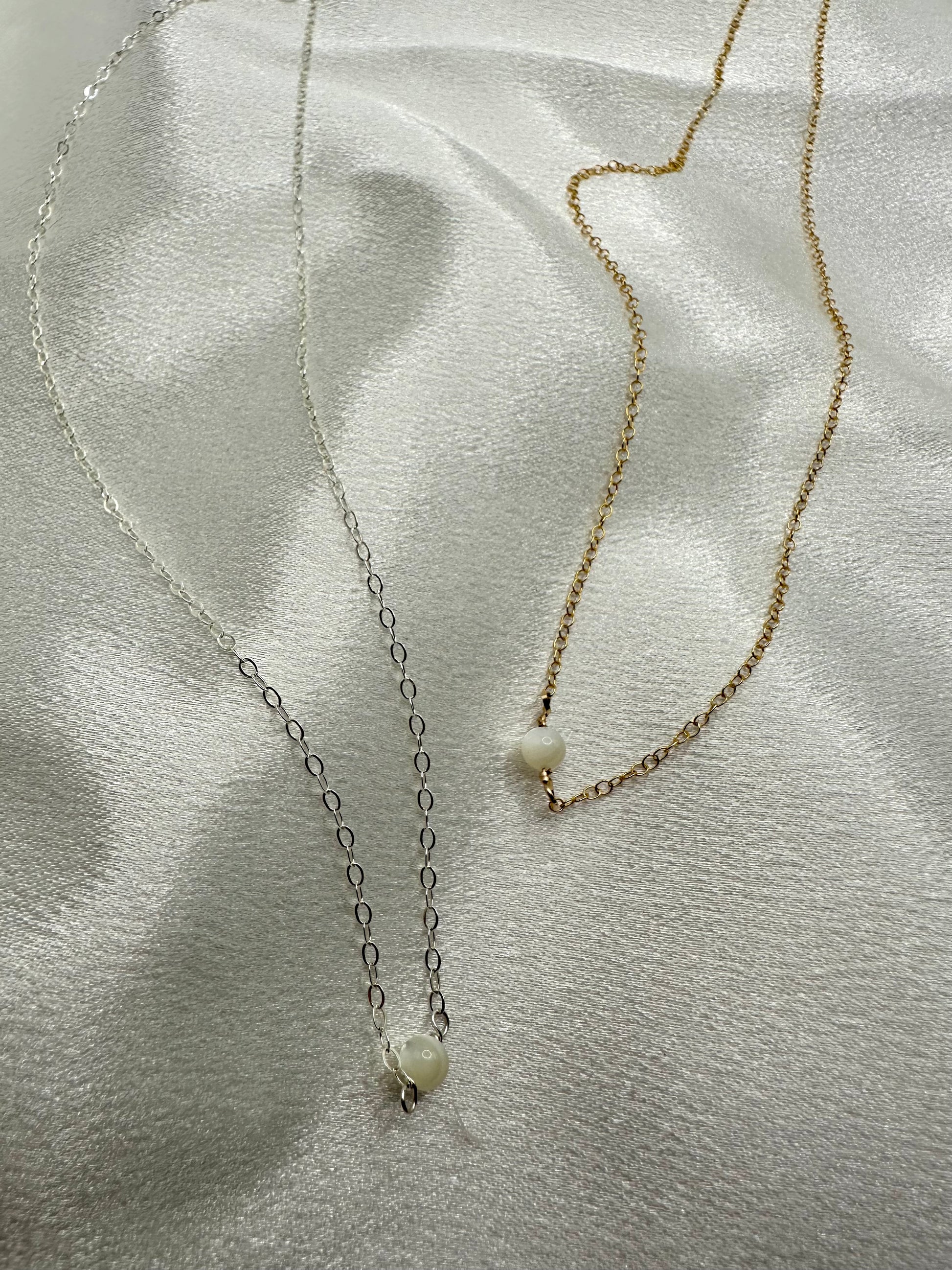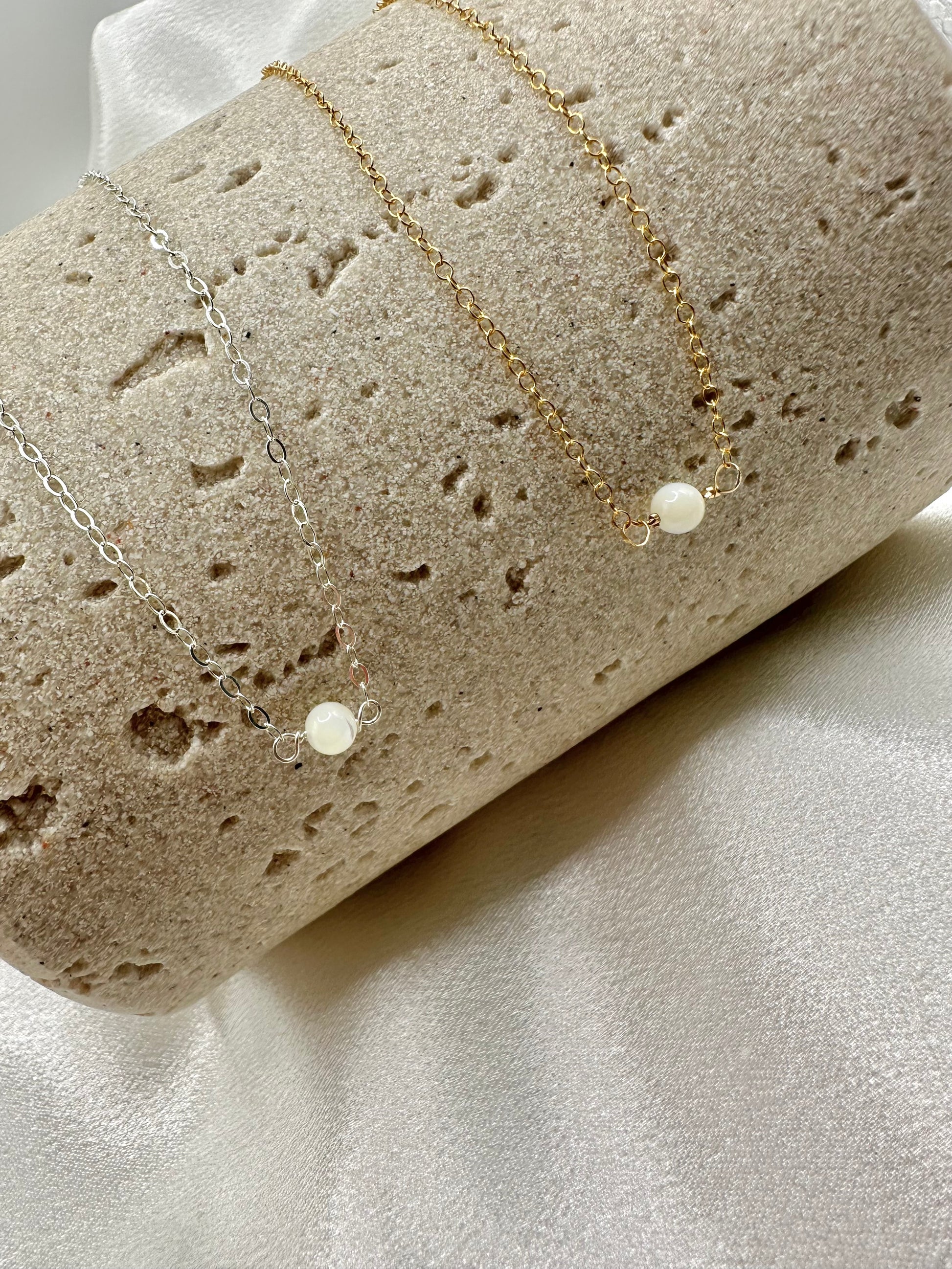 Understated and luminous, this necklace features a single mother of pearl bead on a delicate chain. A minimal piece that adds effortless elegance to any look.